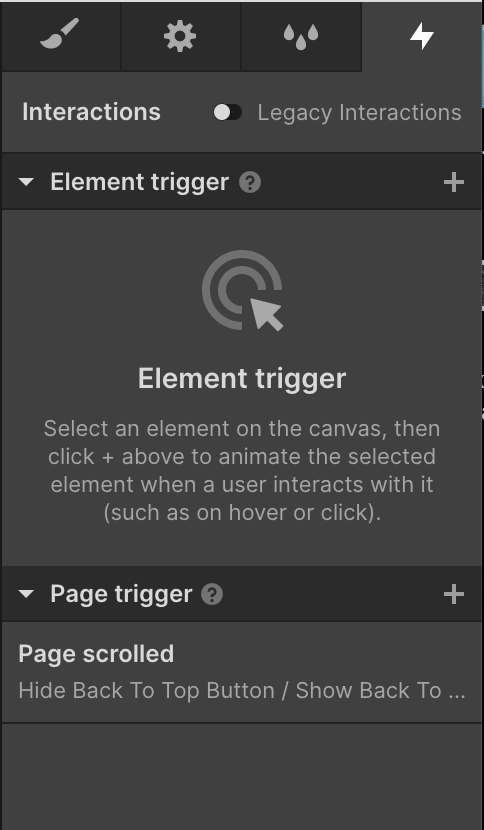 Then, ensure the page has a Page Scrolled interaction with the Hide Back To Top Button interaction activates when the page scrolls up, and the Show Back To Top Button interaction activates when the page scrolls down.