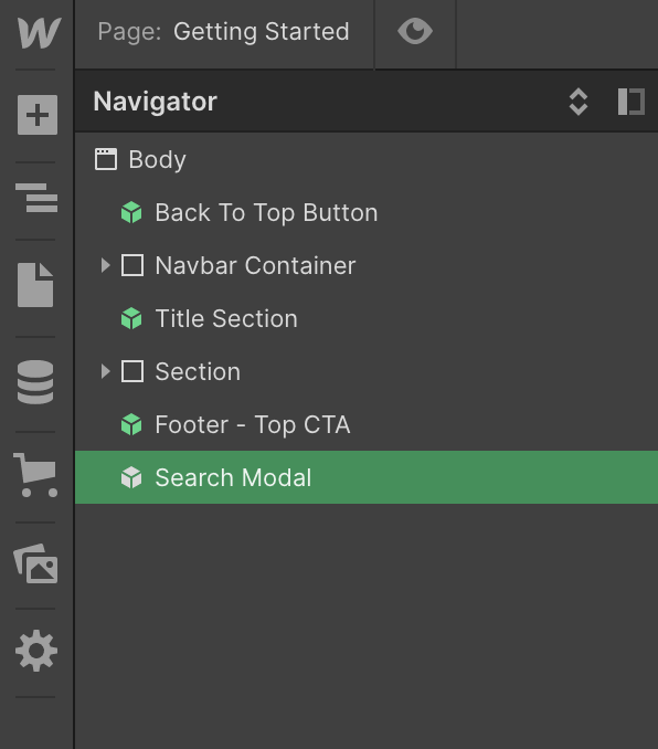 If you're using one of the Navigation Bars that has a search function, you will need to ensure that the Search Modal symbol is place as the last element inside the body of the page.